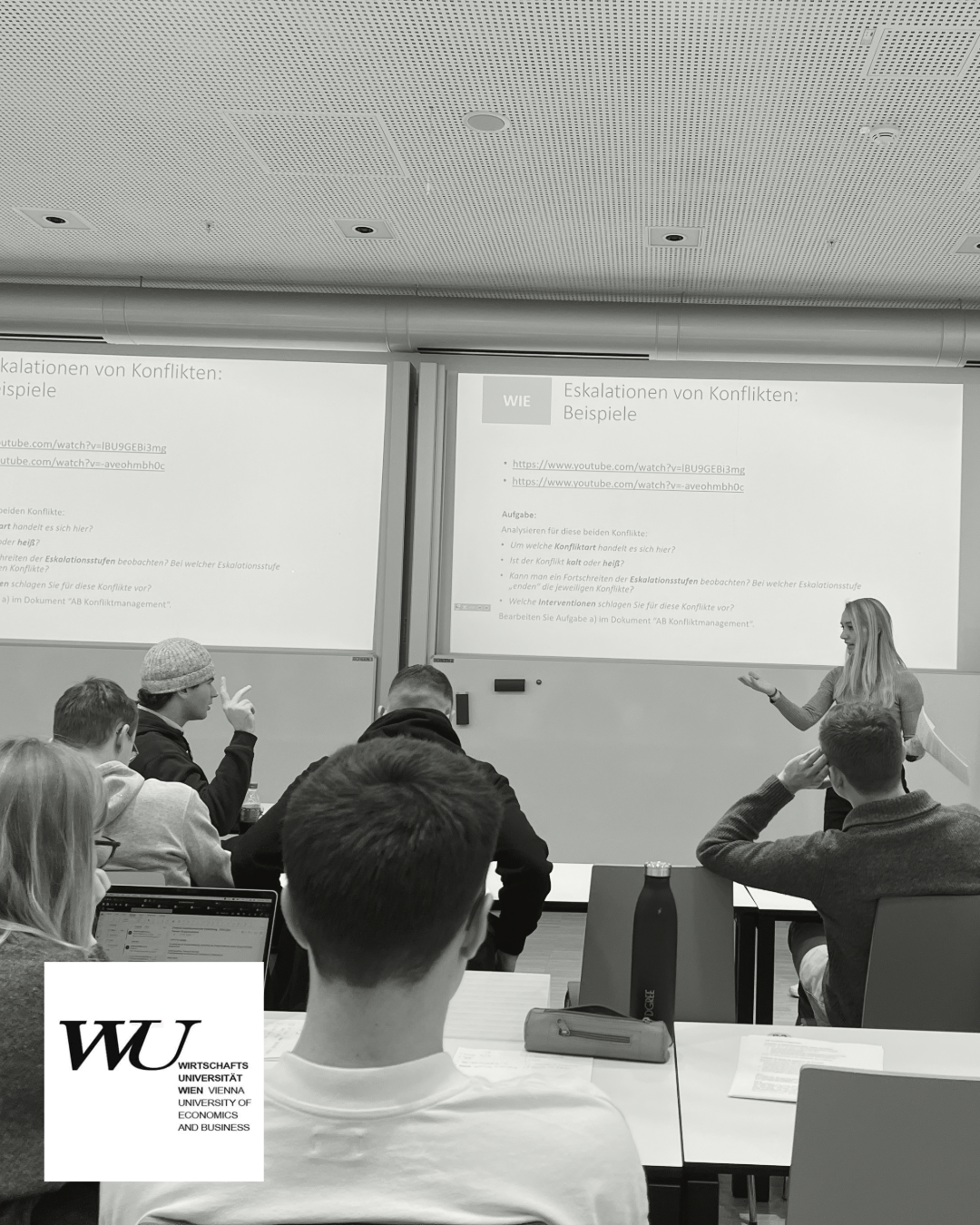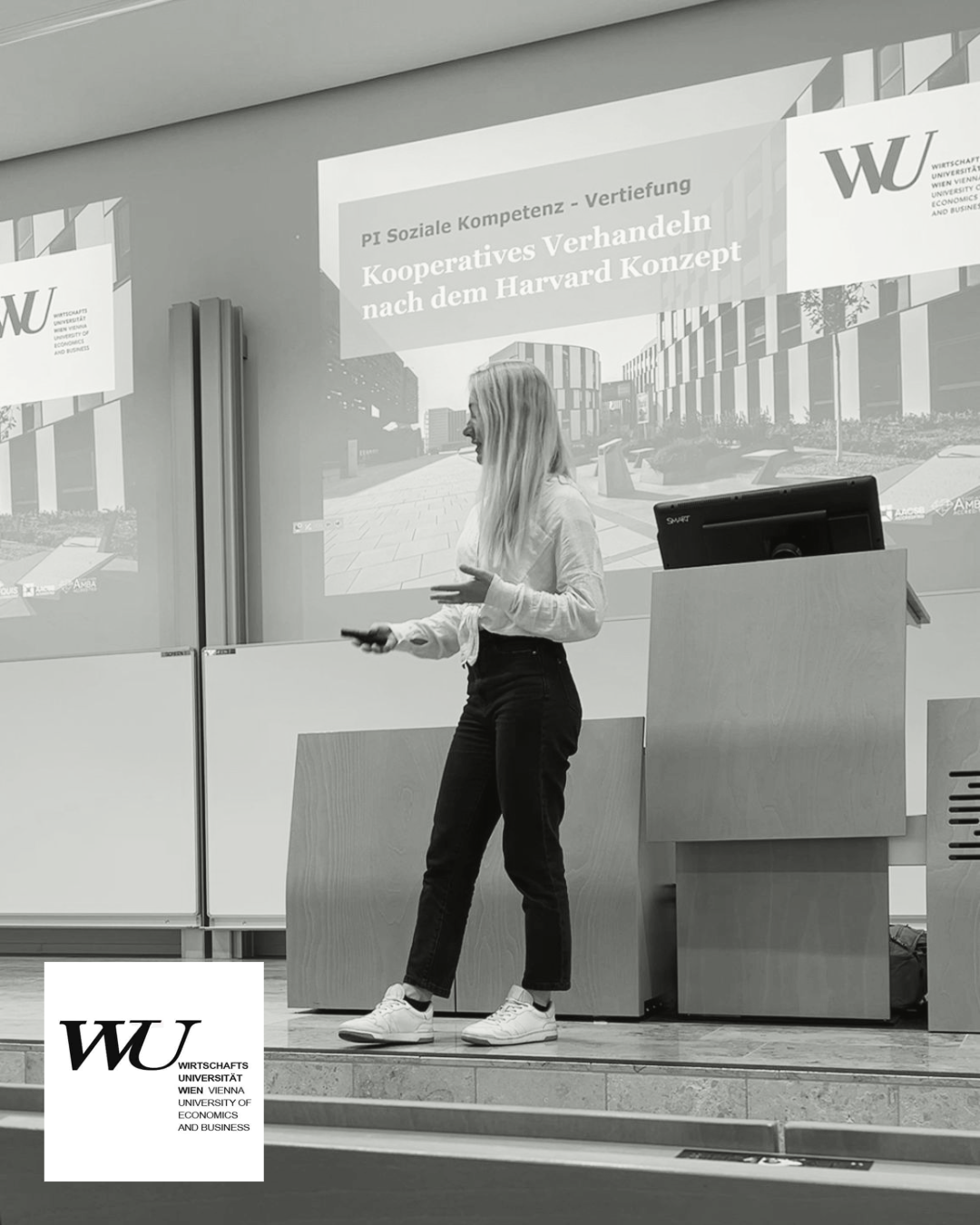 Ich arbeite als selbstständige Soft-Skill-Trainerin mit Unternehmen, Universitäten und Akademien zusammen. Zu meinen Kunden zählen unter anderem Puma, Sparkasse Salzkammergut, Wirtschaftsuniversität Wien, Apollon Hochschule, CAST, BME, FH St. Pölten, Hamburger Fern-Hochschule und viele mehr. Ich leite Seminare zu Kommunikation, Körpersprache, Konfliktmanagement, Verhandlungstechniken und Teamführung.